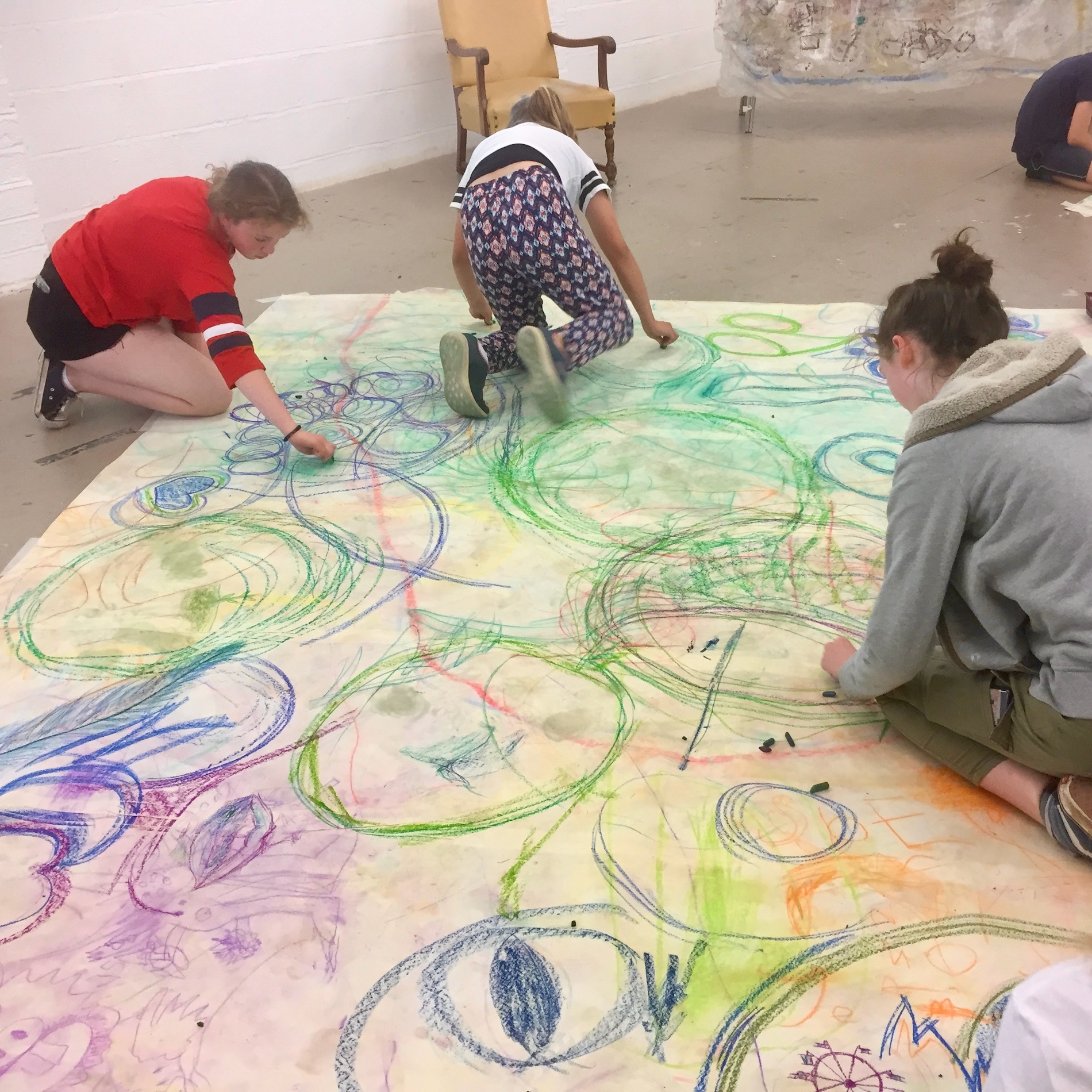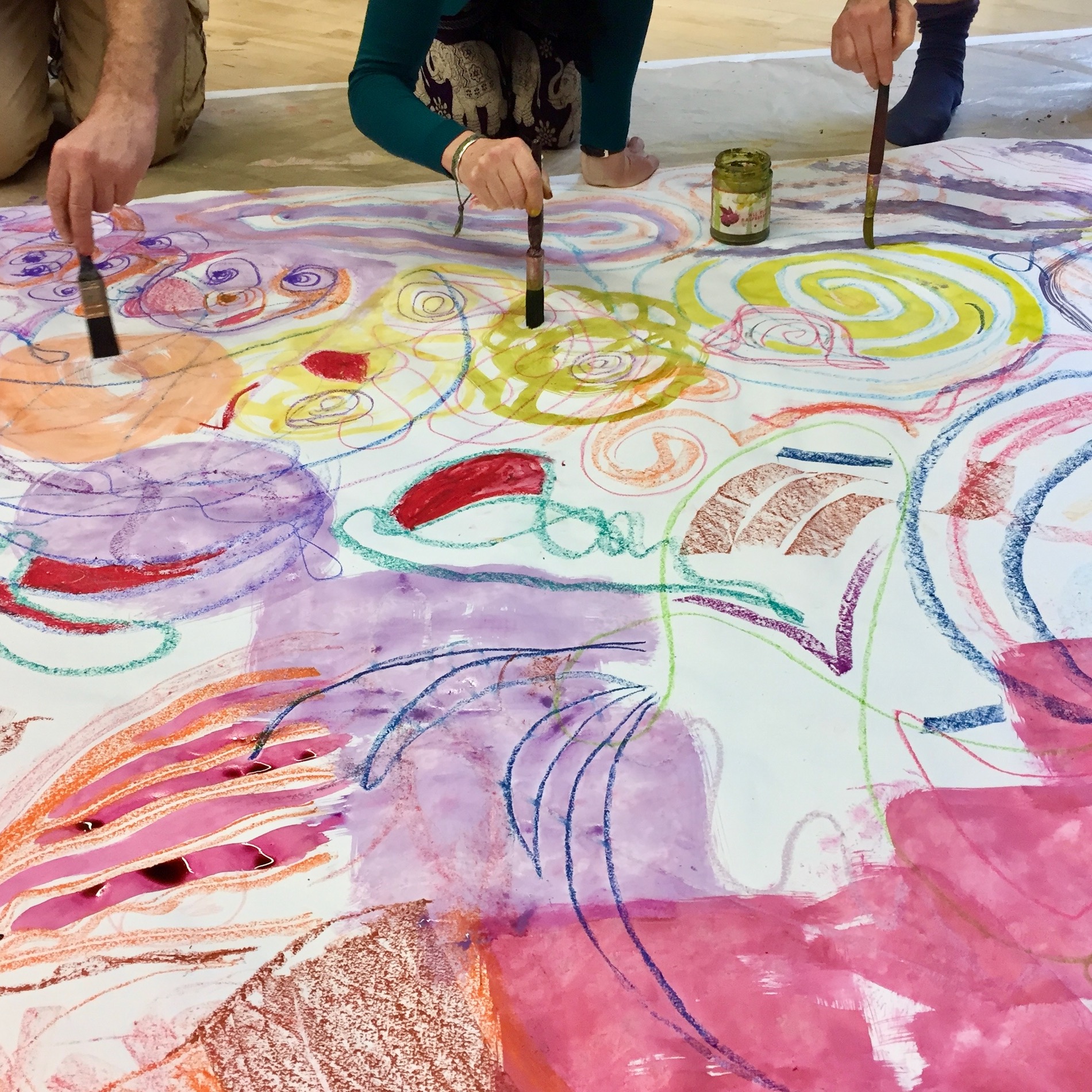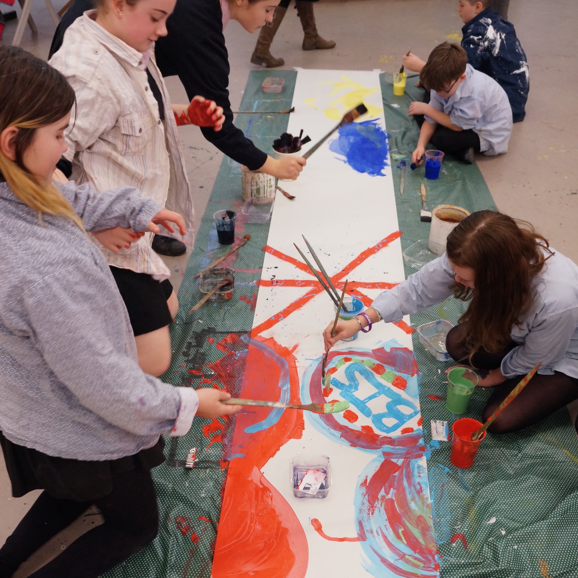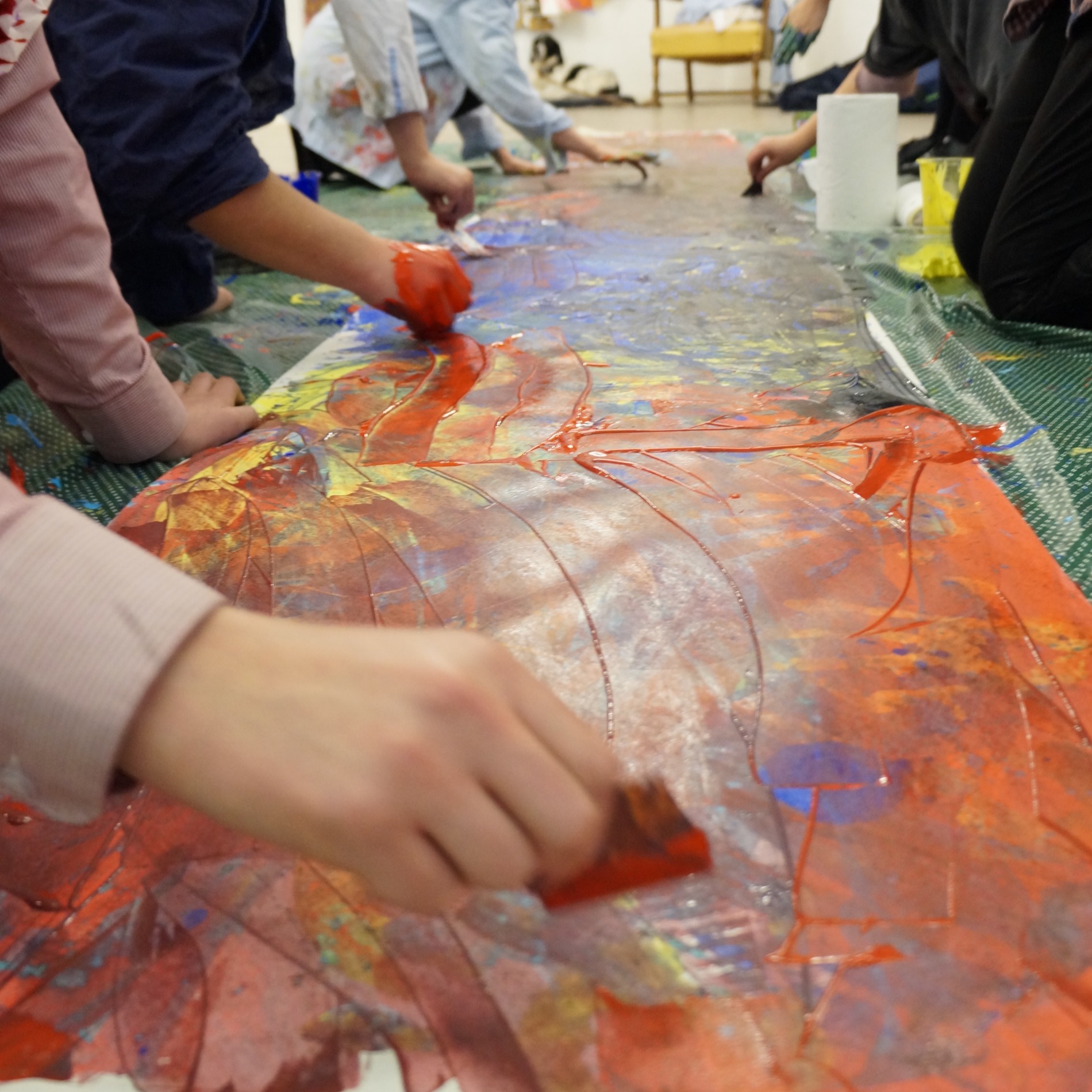 See below for workshop participants in collaborative action as they create these first surfaces over which Sara, back in the studio, adds further layers.