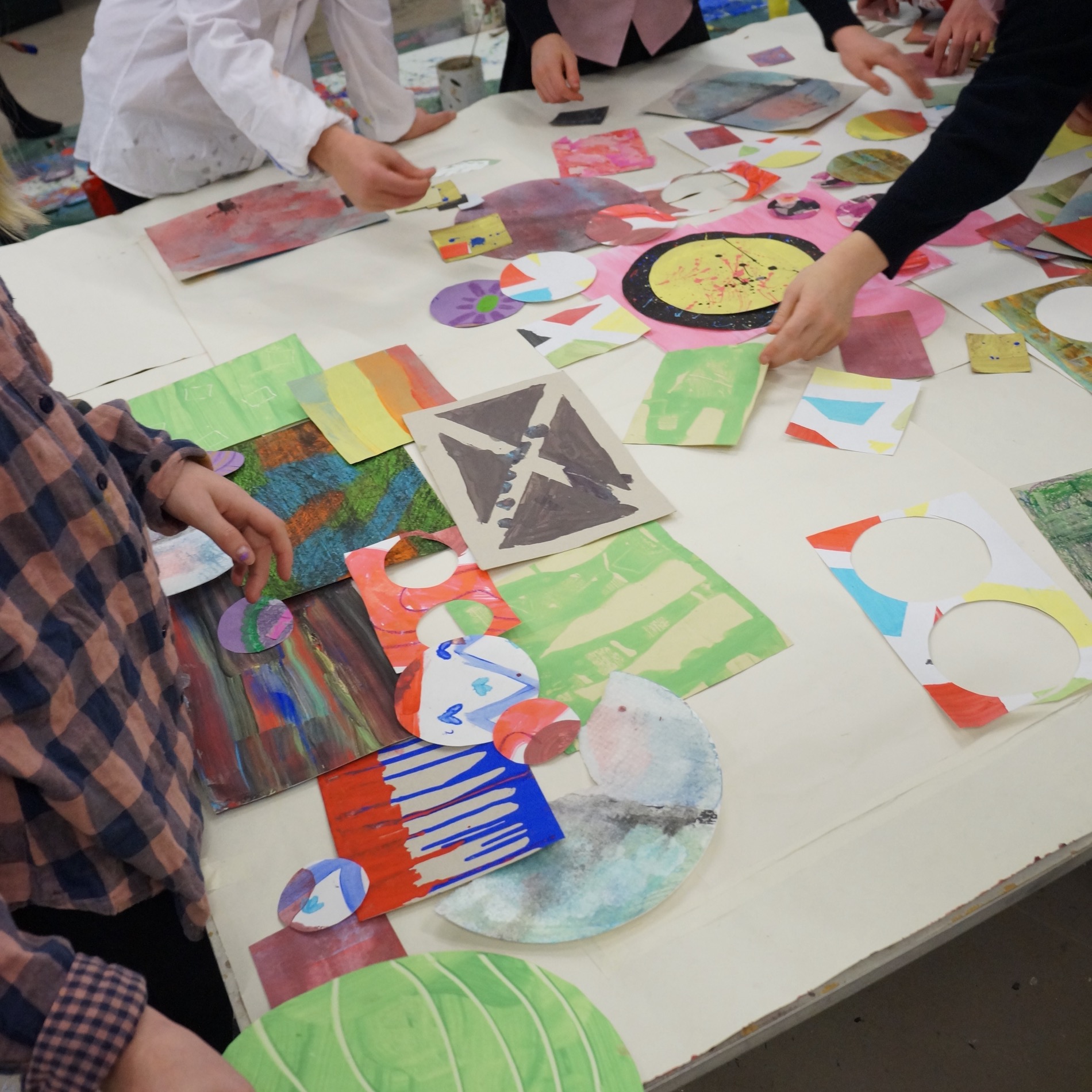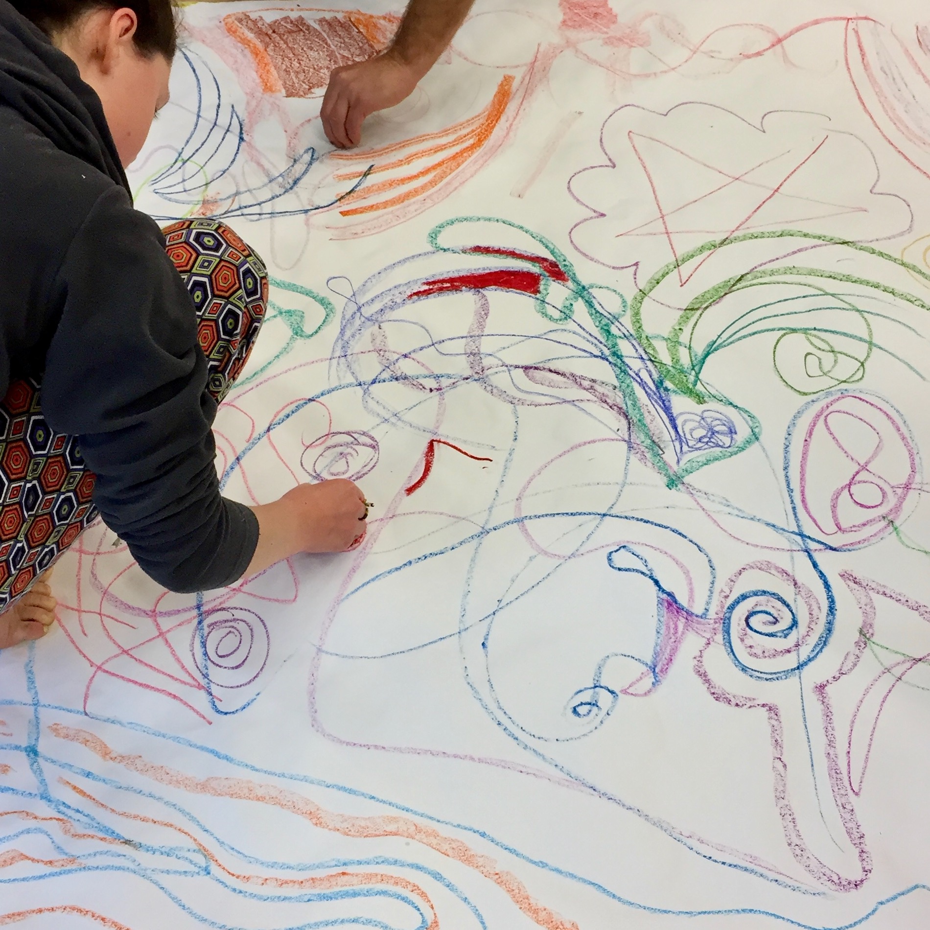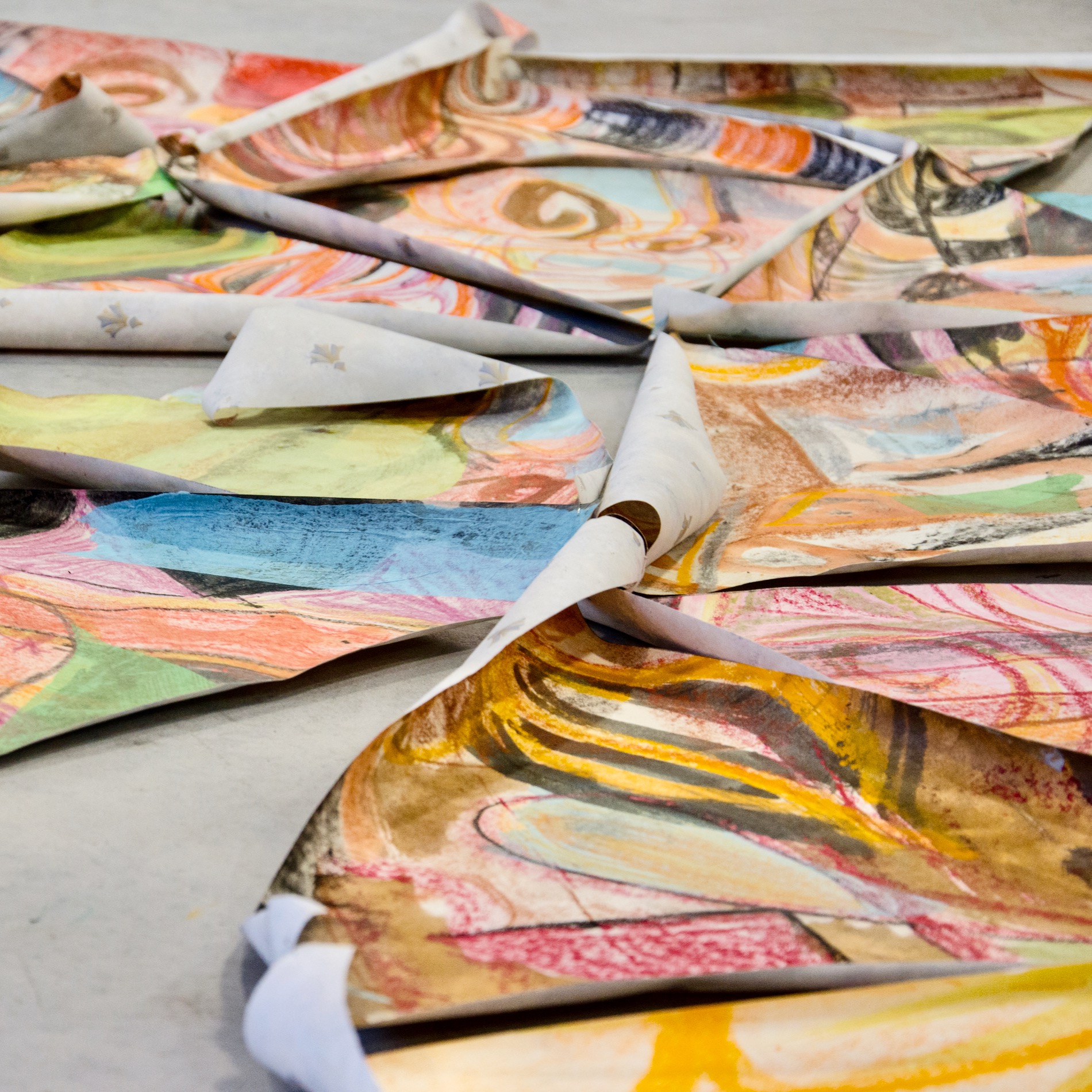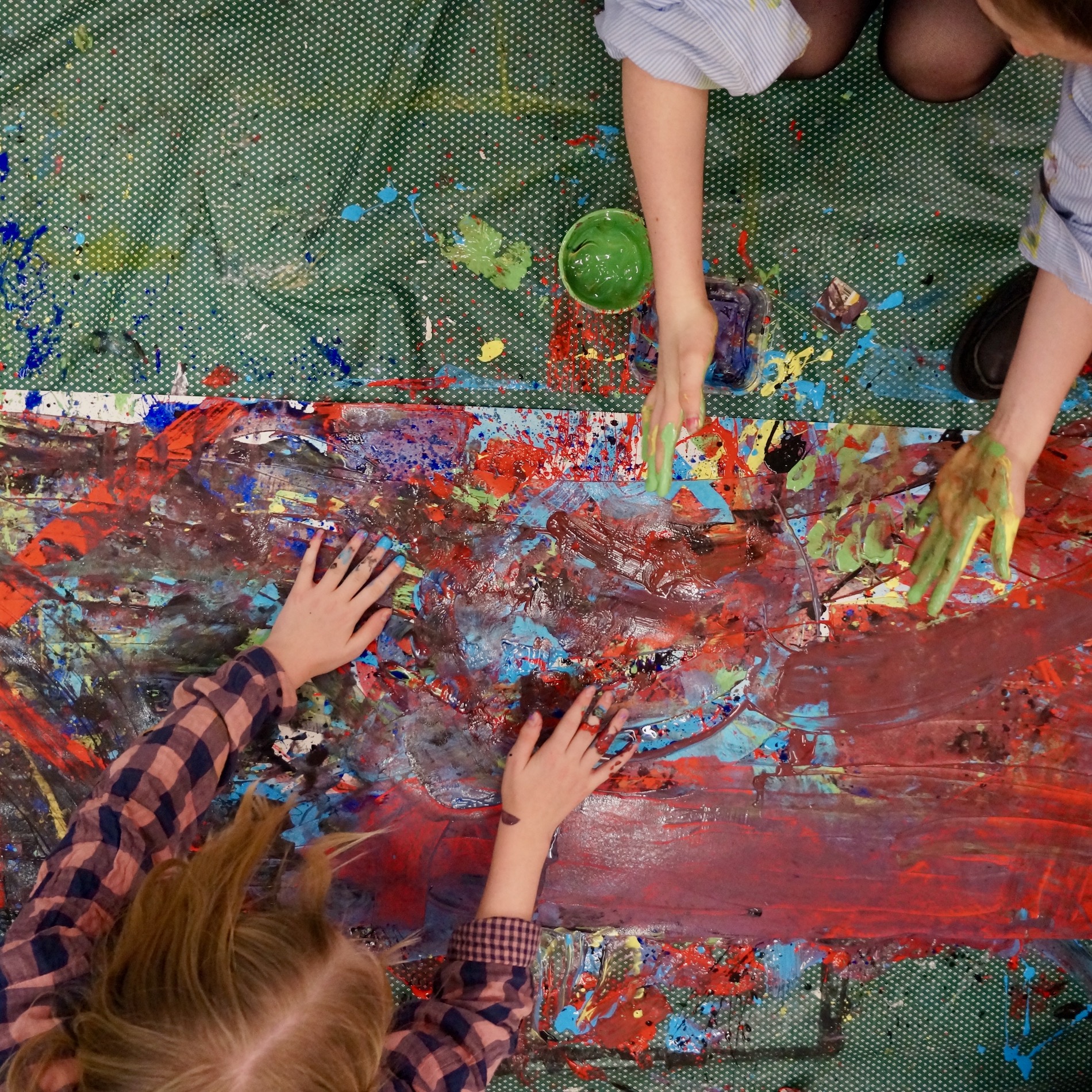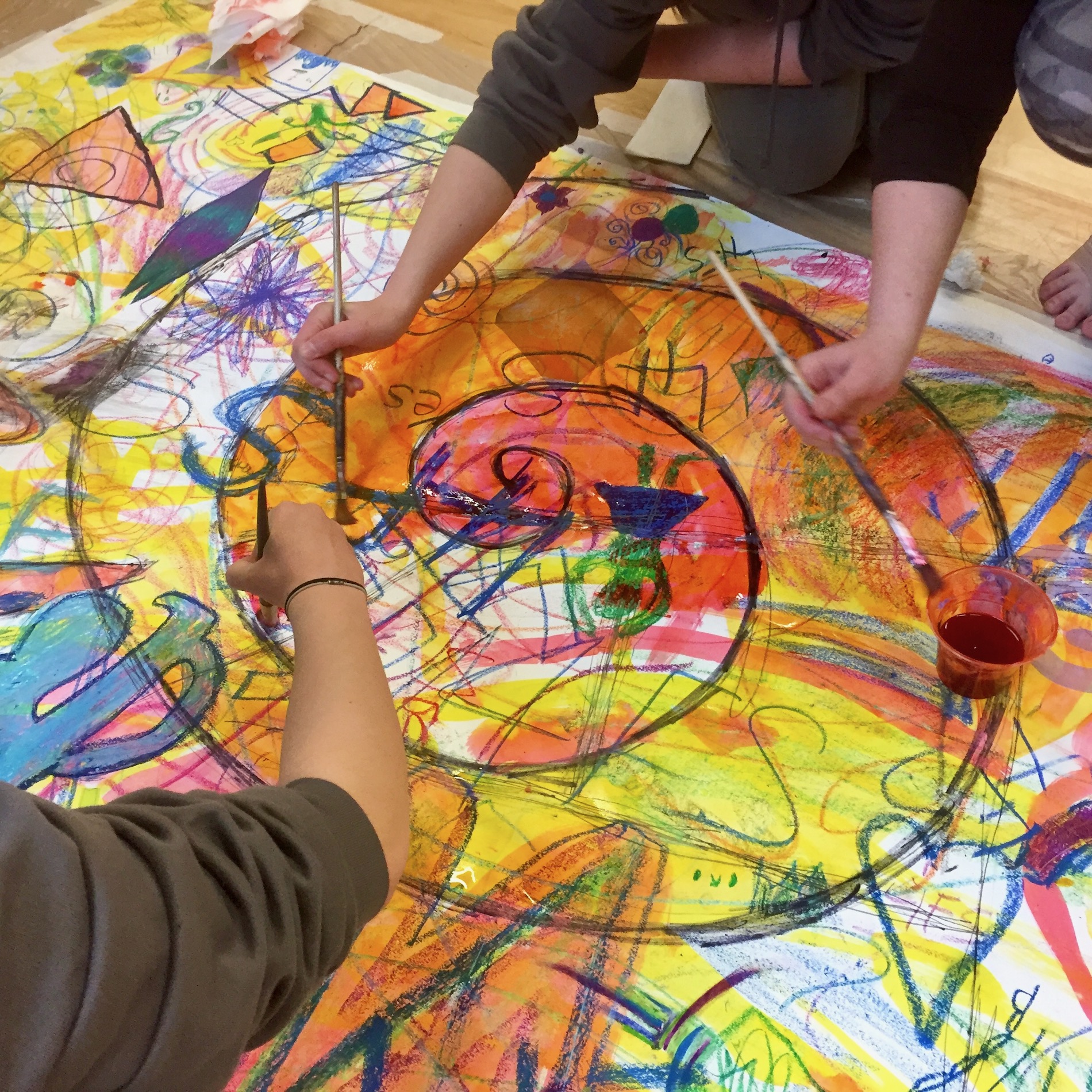 See below for workshop participants in collaborative action as they create these first surfaces over which Sara, back in the studio, adds further layers.