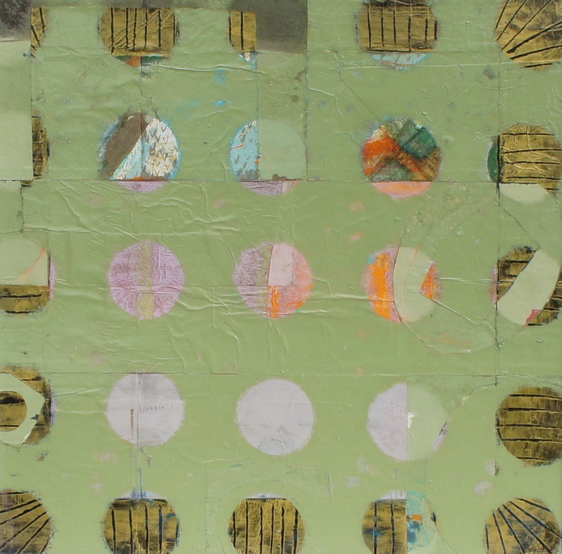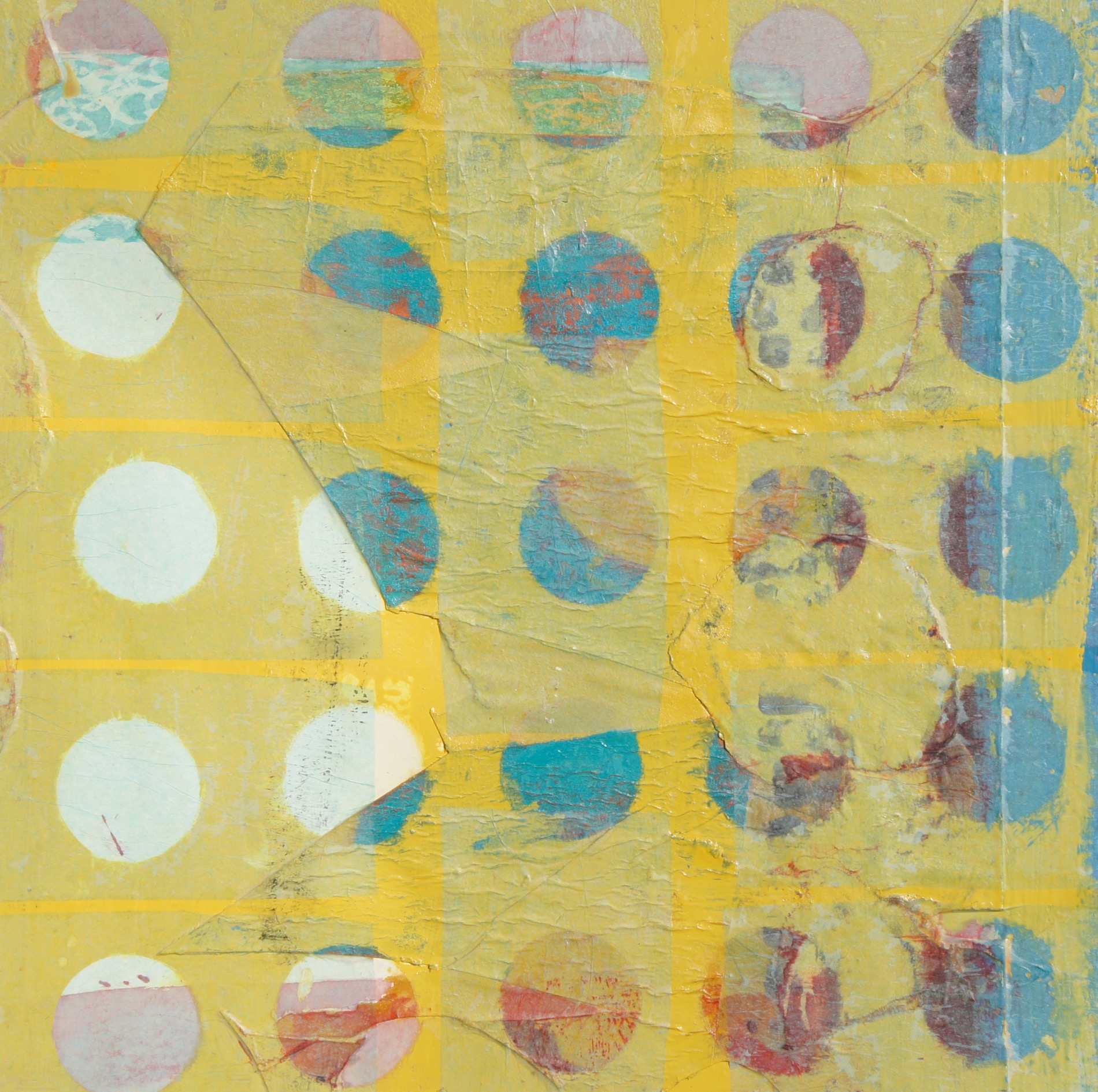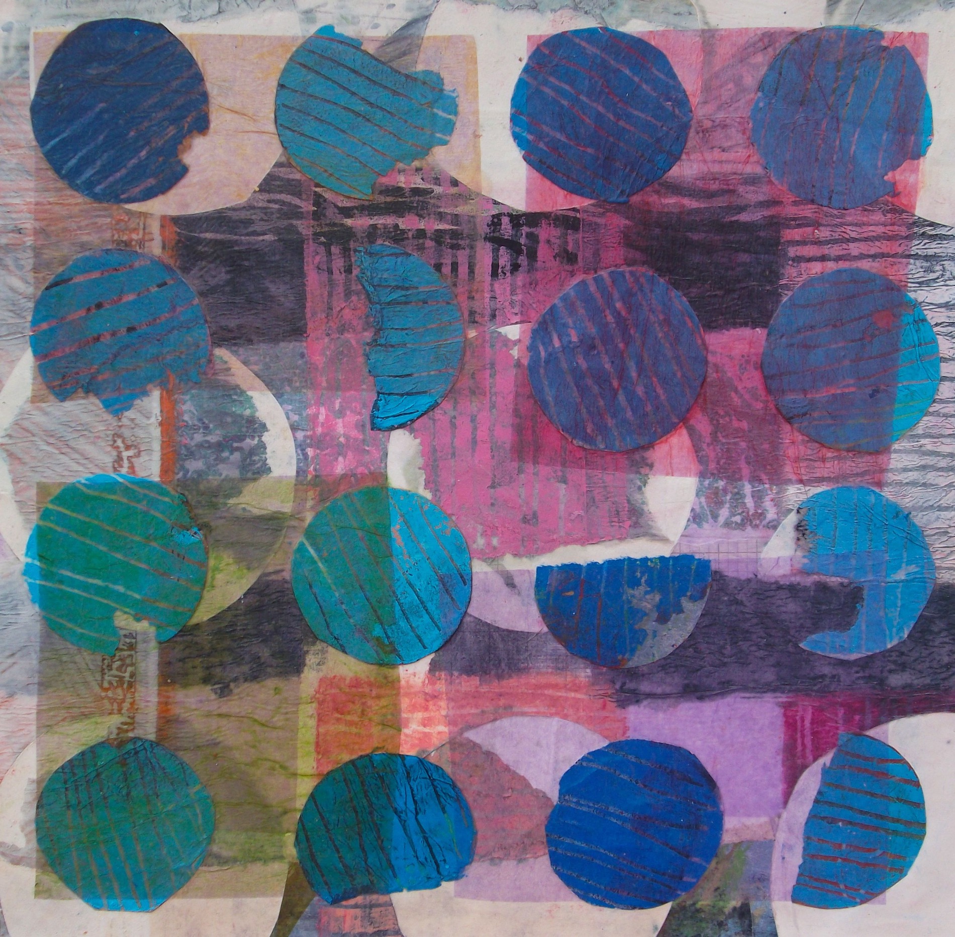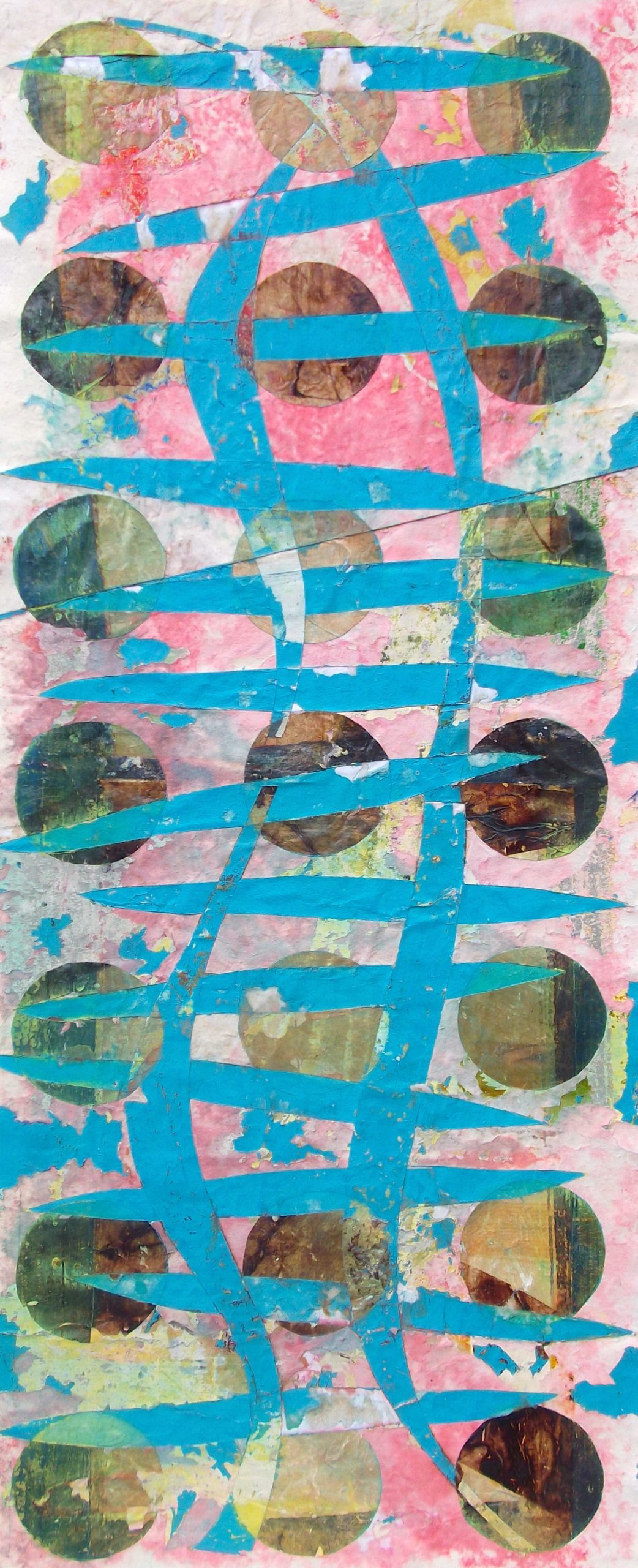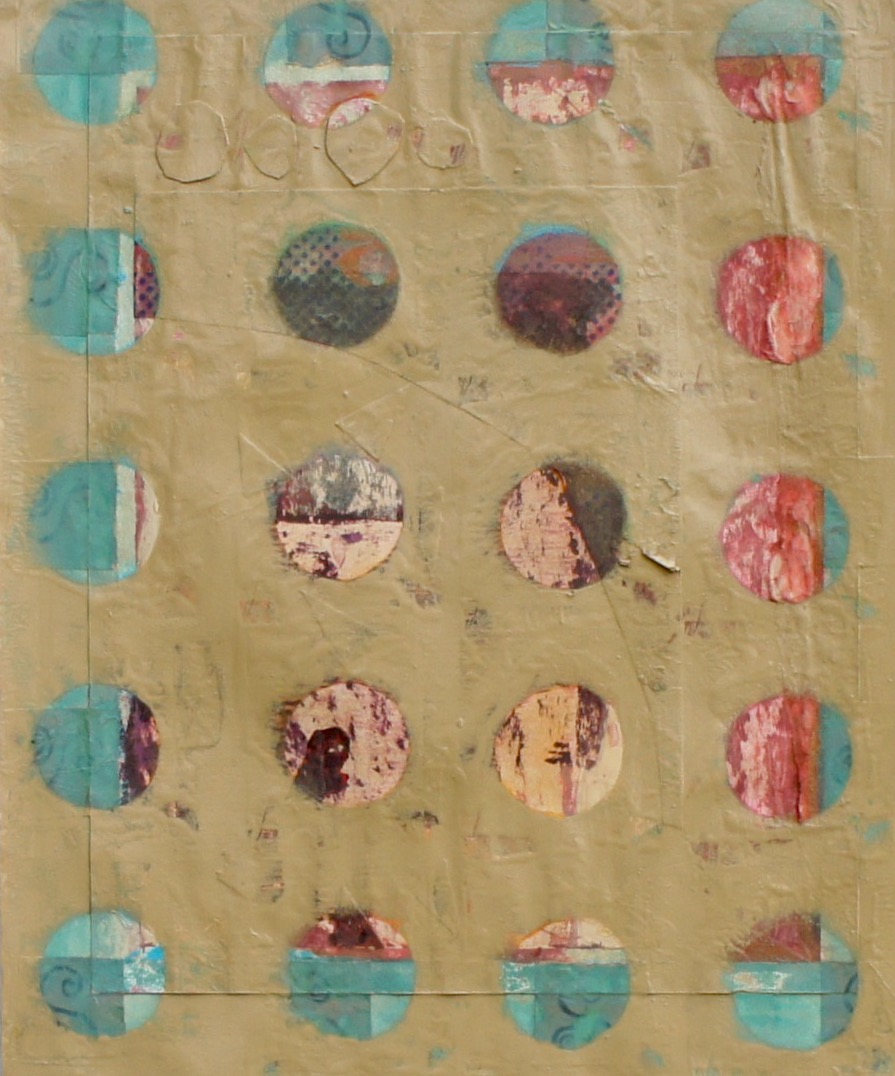 All mixed media on paper, these playful explorations in colour and light, texture and the circle motif, almost look like living organisms, multilayered and colour-saturated. Histories are exposed through traces of layers or others’ ‘lives’ seen beneath the surface.