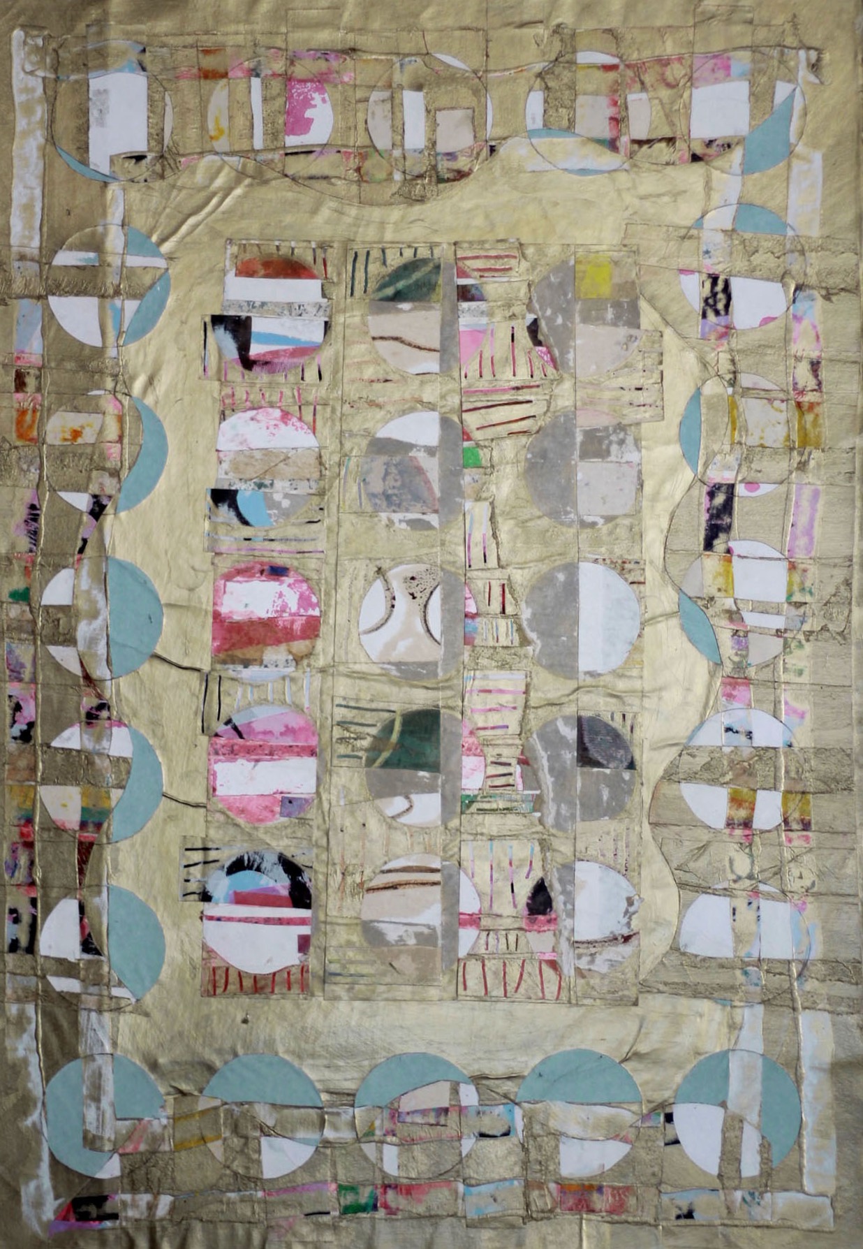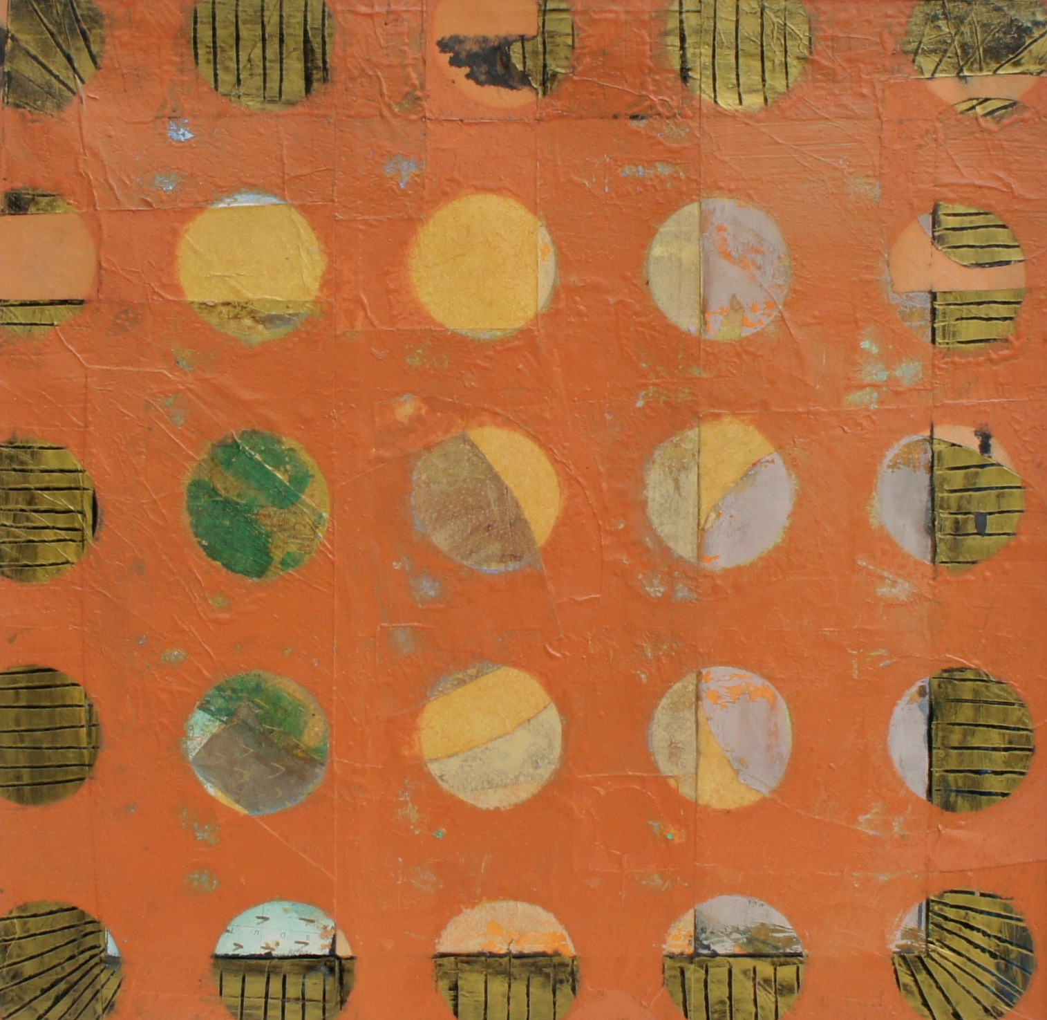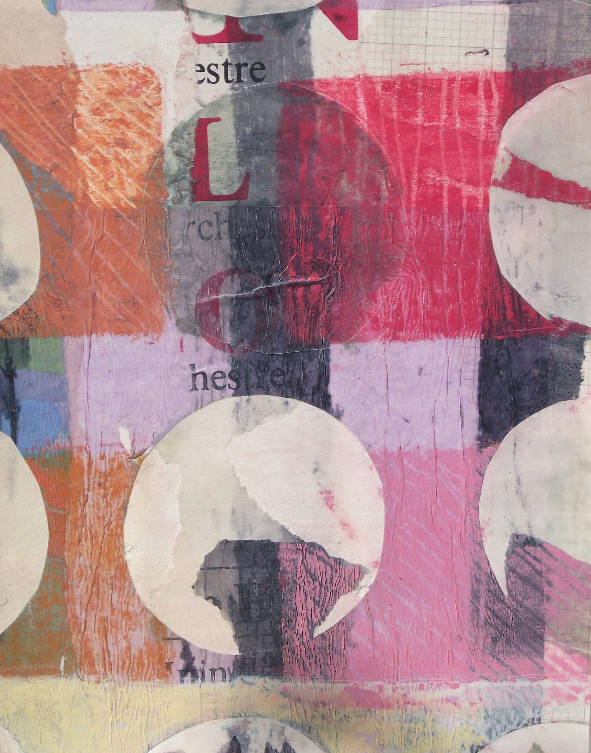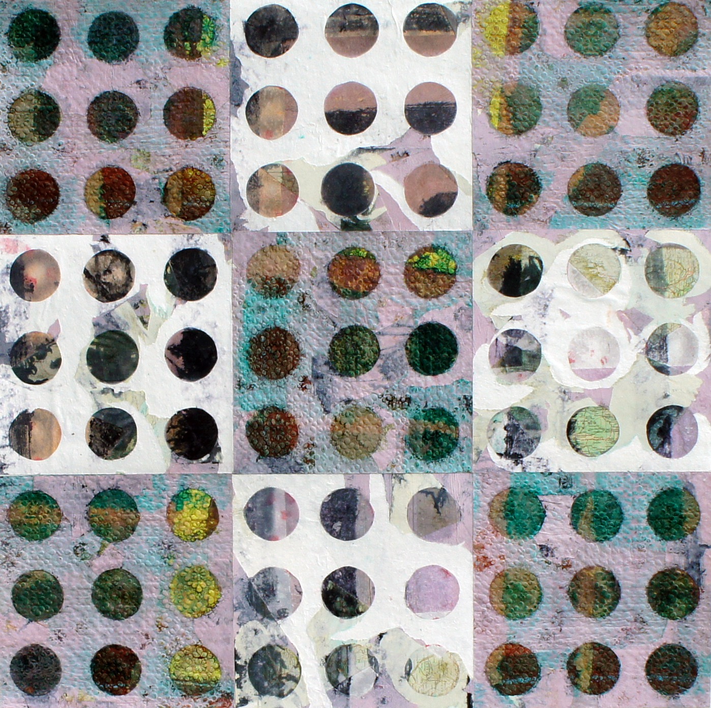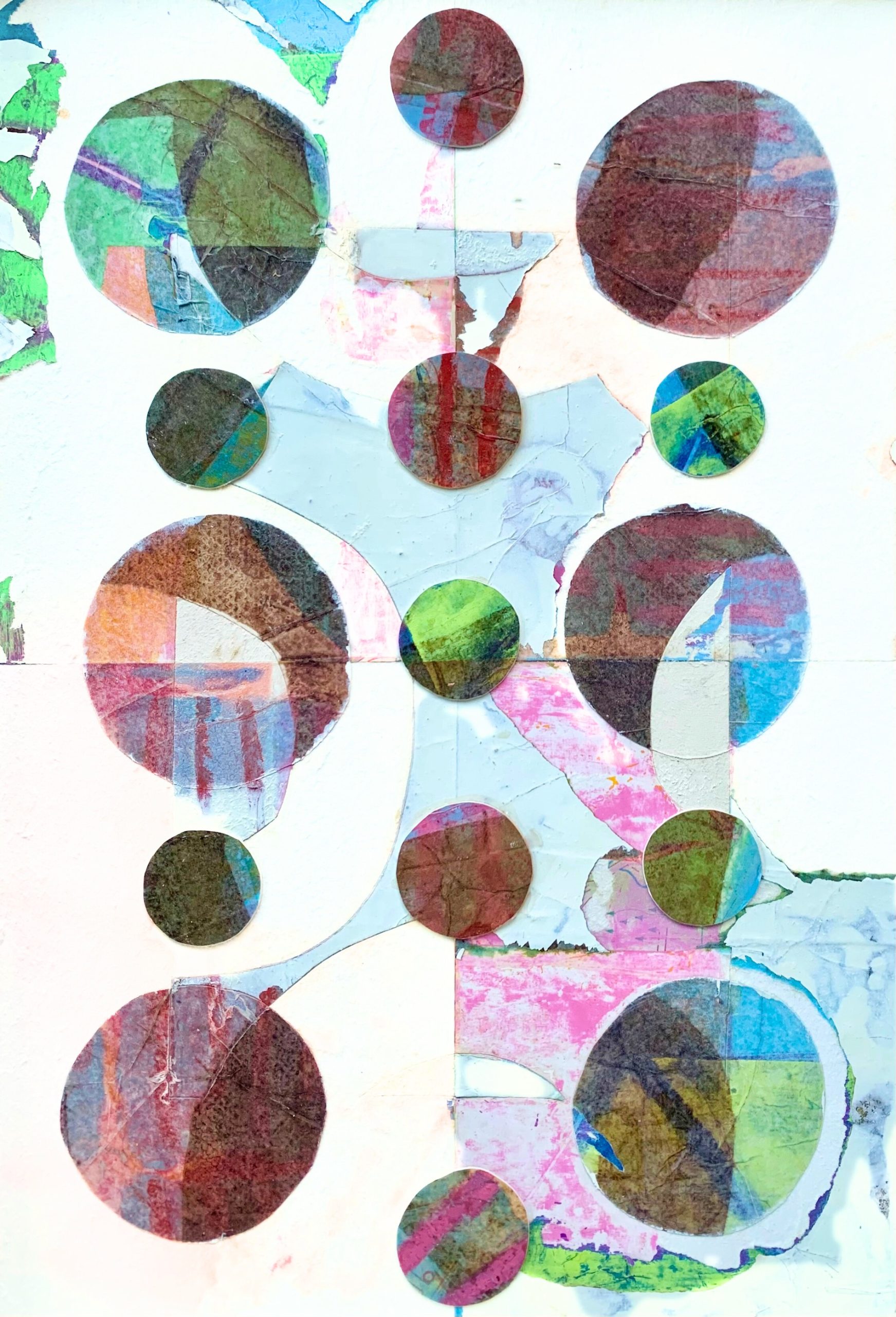 All mixed media on paper, these playful explorations in colour and light, texture and the circle motif, almost look like living organisms, multilayered and colour-saturated. Histories are exposed through traces of layers or others’ ‘lives’ seen beneath the surface.