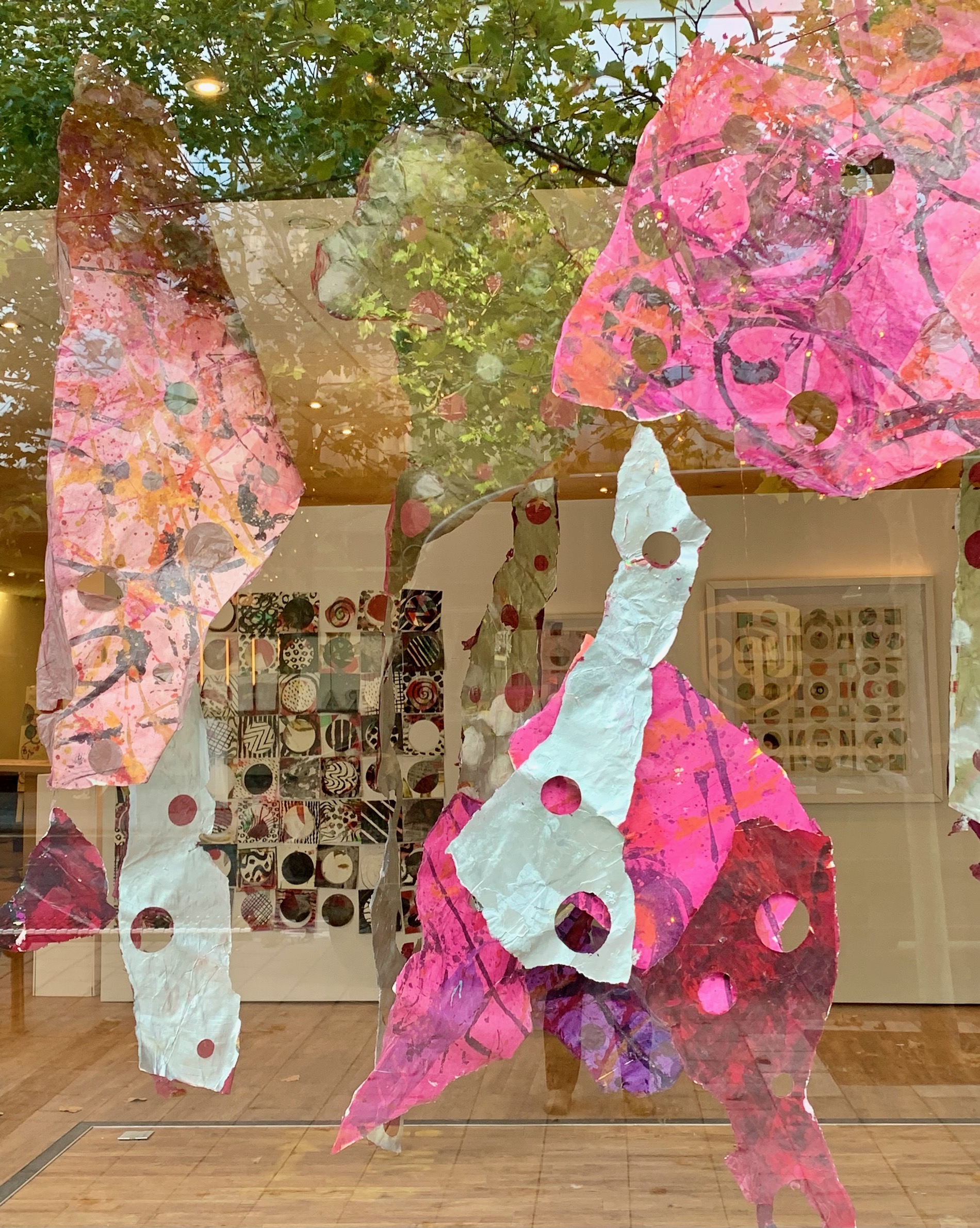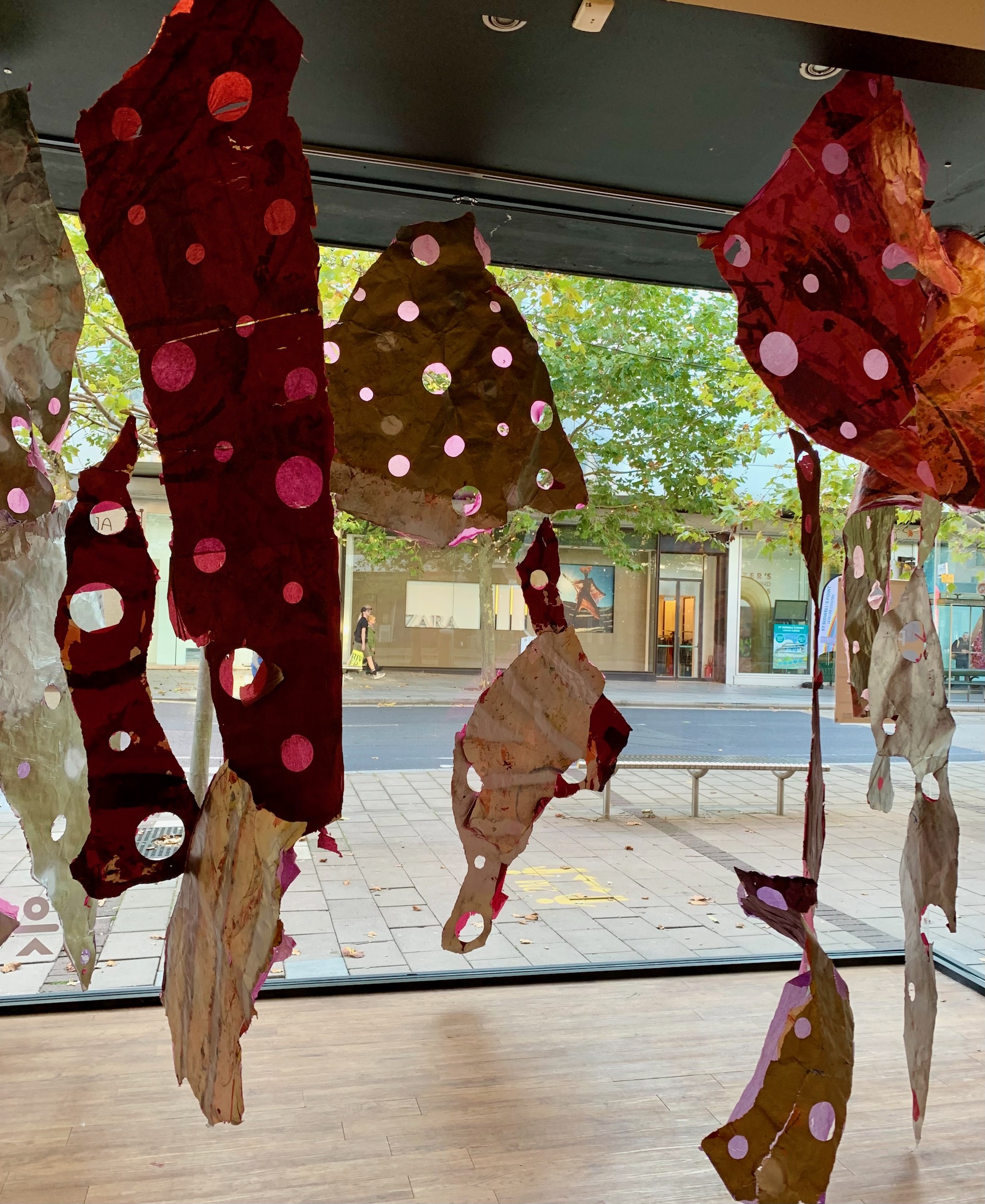 Sara’s installation Mulberry Detritus (approx. 350cm x 400cm), together with the 2D triptych Detritus, began as a 4.5 metre circular floor painting on paper, collaboratively-made with a group of young offenders during a rehabilitation workshop. Post session, alone in the studio, Sara tears, punctures holes and slaps on layers of mulberry-hued paper onto the first layers of expressionistic painting. Moving away from her 2D habits, she challenges the walk-along-the-wall-looking-at-art convention. Stimulating a more active involvement with the artwork – walk around, peer through, stretch to look up, bending down to see what’s underneath – the experience of looking becomes more memorable.